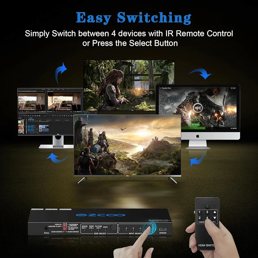 سوئیچر HDMI 2.1 چهار ورودی به یک خروجی با قابلیت استخراج صدا، یک راهکار حرفهای و بهروز برای مدیریت همزمان چند منبع تصویری و صوتی است. این دستگاه به شما اجازه میدهد تا ۴ دستگاه HDMI مانند PS5، Xbox Series X، Apple TV، لپتاپ یا ستاپباکس را به یک نمایشگر متصل کرده و بدون افت کیفیت، بین آنها جابهجا شوید.