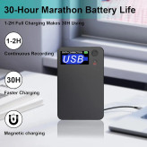 جواب: با باتری داخلی تا حدود ۳۰–۶۰ ساعت ضبط مداوم و حافظه ۶۴GB برای صدها ساعت محتوای صوتی. �