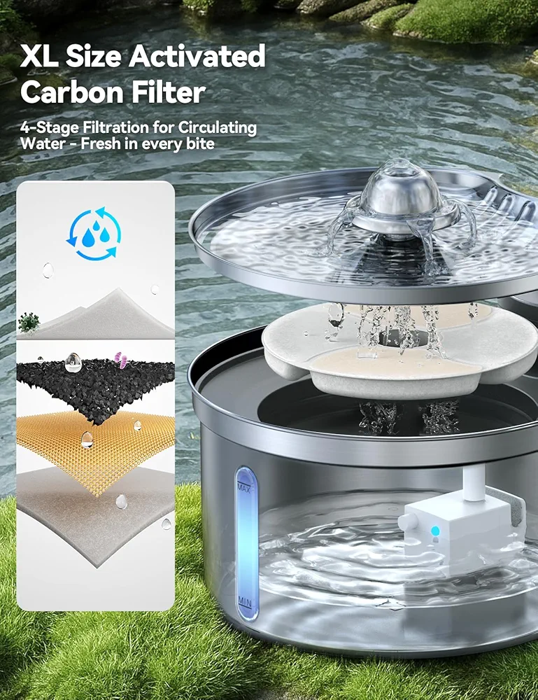 این فونتین آب شارژی گربه مجهز به سیستم فیلتراسیون چندلایه است که ناخالصیها، مو و ذرات معلق را حذف میکند و آبی سالمتر در اختیار حیوان قرار میدهد. همچنین پمپ کمصدا، استفاده از آن را در شب بدون ایجاد مزاحمت ممکن میسازد.