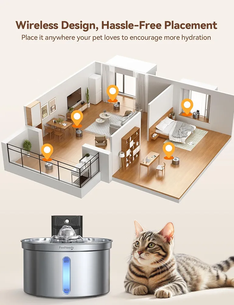 استفاده از آبخوری اتوماتیک گربه باعث میشود آب همیشه تازه و در گردش باشد، که این موضوع به افزایش مصرف آب و پیشگیری از مشکلات کلیوی در گربهها کمک میکند. طراحی بیسیم دستگاه، آن را برای استفاده در هر نقطه از منزل مناسب کرده و دیگر نیازی به نزدیکی پریز برق نخواهید داشت.