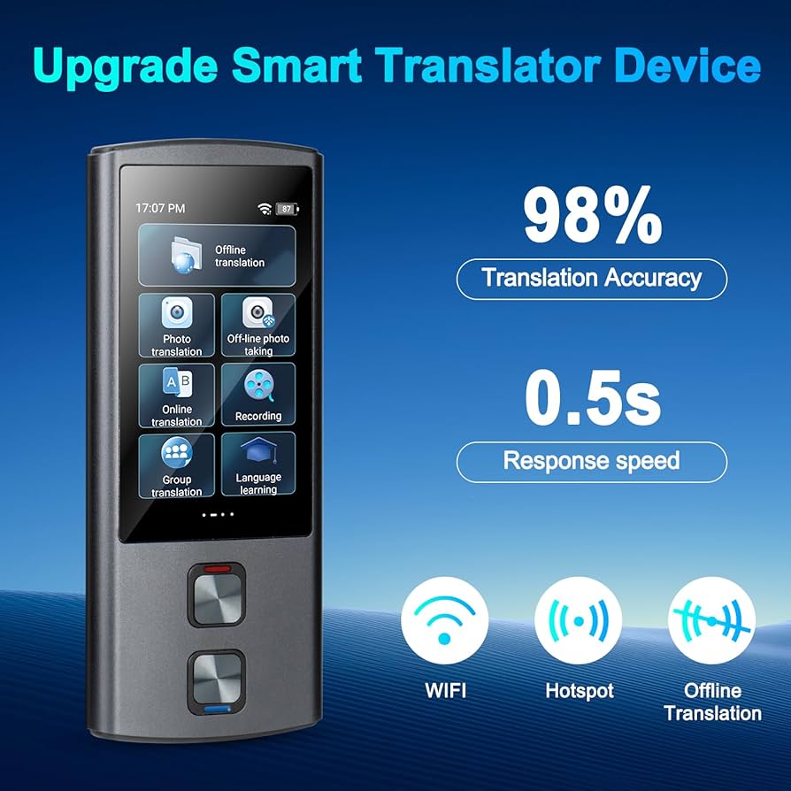 دستگاه مترجم زبان هوشمند T17 دوربیندار ۱۳۸ زبانه یک ابزار قدرتمند و کاربردی برای افرادی است که در سفرهای خارجی، جلسات کاری بینالمللی، تحصیل یا ارتباط با افراد چندزبانه به ترجمه سریع و دقیق نیاز دارند. این دستگاه با بهرهگیری از هوش مصنوعی پیشرفته، ترجمه صوتی و تصویری را در لحظه انجام میدهد و موانع زبانی را بهطور کامل از میان برمیدارد.