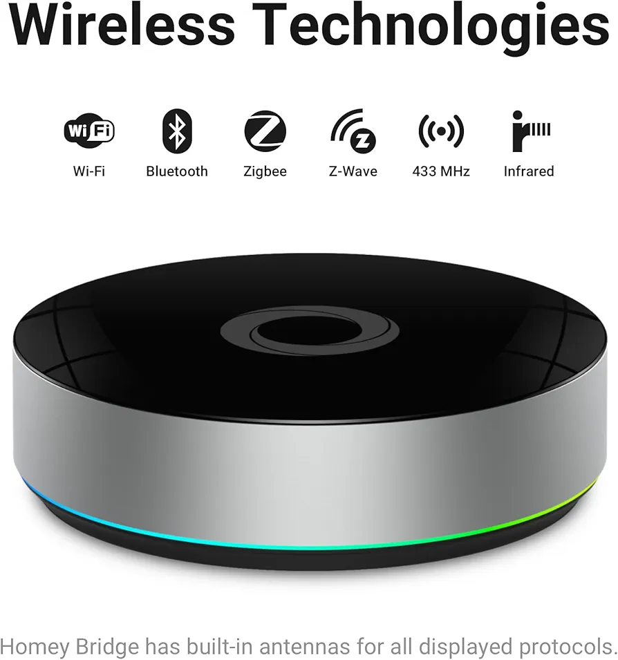 Homey Bridge یک مرکز کنترل هوشمند برای خانههای مدرن است که تجربهی اتوماسیون خانه را ساده و هوشمند میکند. با پشتیبانی از چندین پروتکل ارتباطی مانند Zigbee، Z-Wave، Wi-Fi، بلوتوث LE، رادیو 433 مگاهرتز و مادون قرمز، این پل هوشمند امکان اتصال و کنترل تمامی دستگاههای خانه هوشمند شما را از یک اپلیکیشن واحد فراهم میکند.