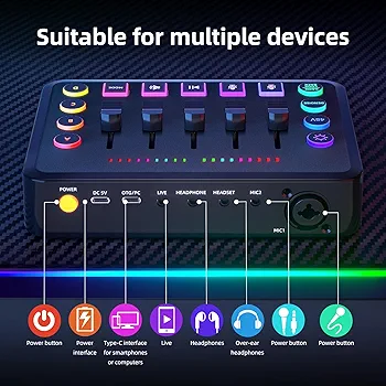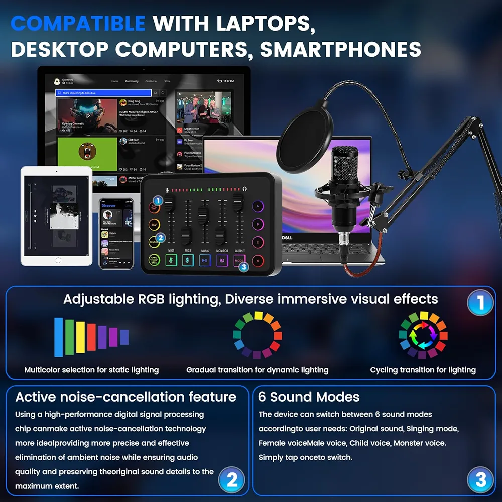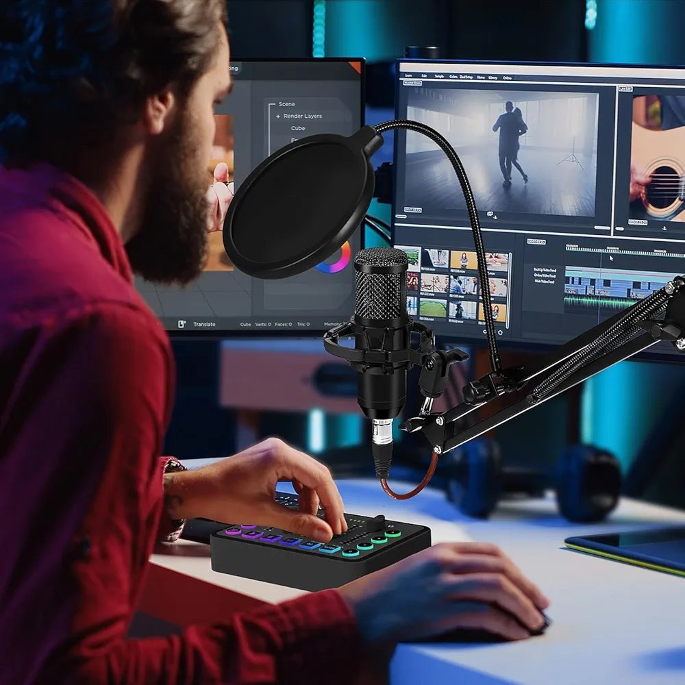 این پکیج شامل میکسر صوتی حرفهای نیز میباشد که امکان تنظیم بلندی صدا، اضافه کردن افکتهای صوتی و کنترل ورودیها را به شما میدهد. اتصال از طریق USB و جک ۳.۵ میلیمتری انجام میشود و به راحتی با کامپیوتر، لپتاپ و دوربینهای دیجیتال سازگار است.