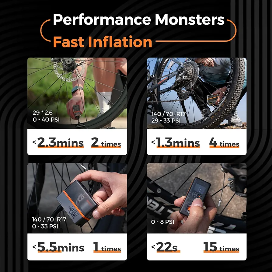 با حداکثر فشار ۱۲۰ PSI، این پمپ امکان تنظیم دقیق باد تایرها را فراهم میکند و با داشتن آداپتورهای Schrader و Presta، با انواع شیرهای رایج سازگار است. نمایشگر دیجیتال تعبیه شده روی پمپ، فشار تایر را به صورت دقیق نشان میدهد و به شما کمک میکند بدون نگرانی از باد زیاد یا کم، تایرها را باد کنید.
