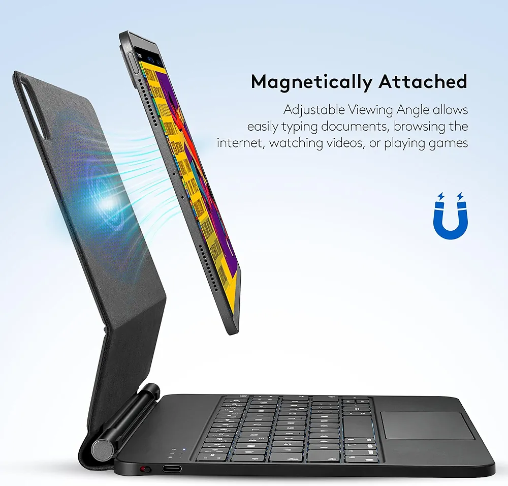 کیبورد بلوتوثی نسل جدید با طراحی شناور و تاچپد داخلی، یک انتخاب حرفهای برای کاربرانی است که میخواهند تبلت یا آیپد خود را به یک ابزار کاری قدرتمند تبدیل کنند. این کیبورد با طراحی Floating (شناور) امکان تنظیم زاویه دید ایدهآل را فراهم میکند و تجربهای مشابه لپتاپ را در اختیار شما میگذارد.